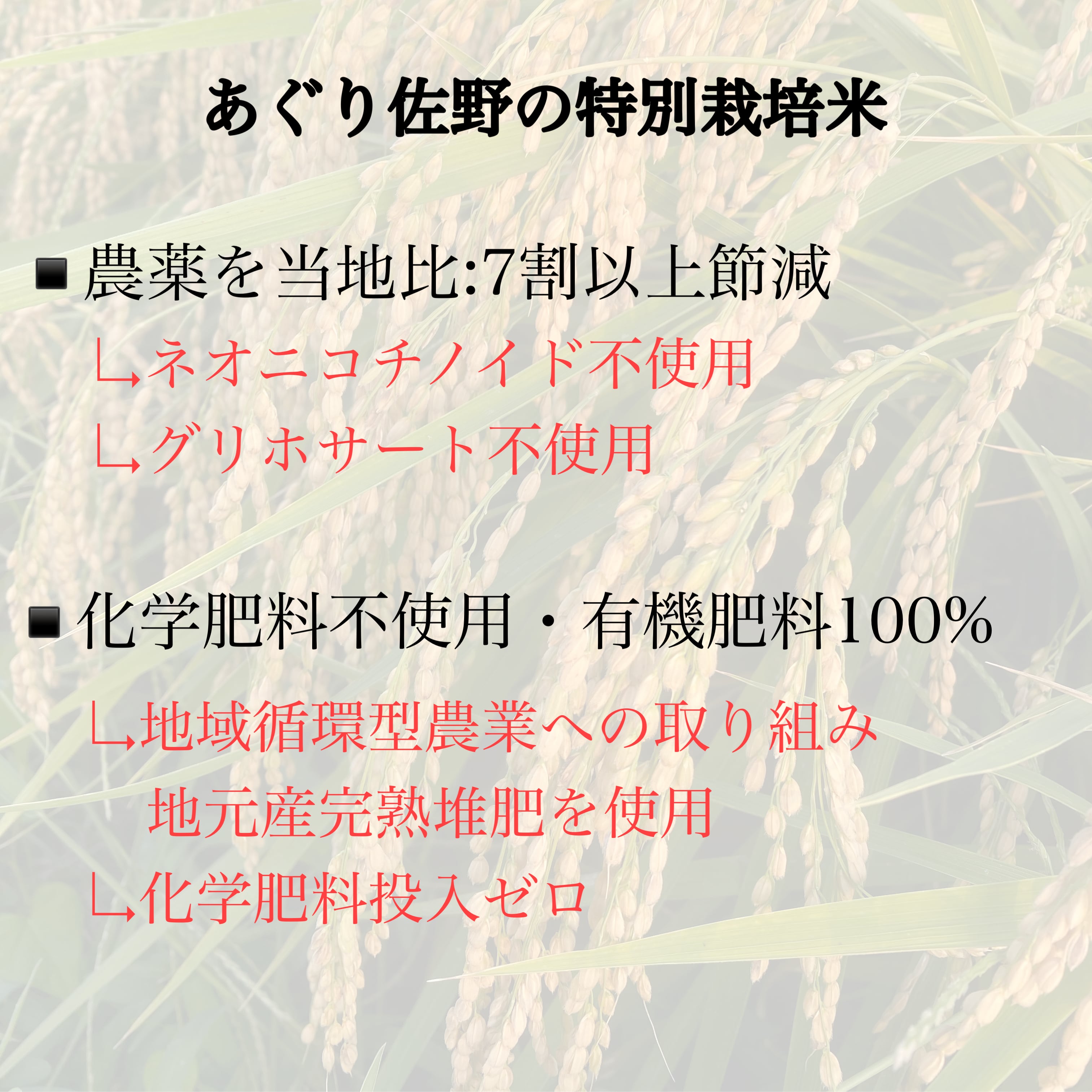 化学肥料半分以下であれば「特別栽培米」ですが、「あぐり佐野の特別栽培米」は身体や環境への影響を考慮し化学肥料は一切使用していません。